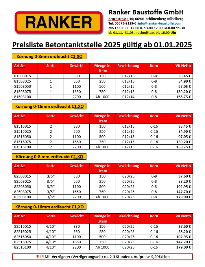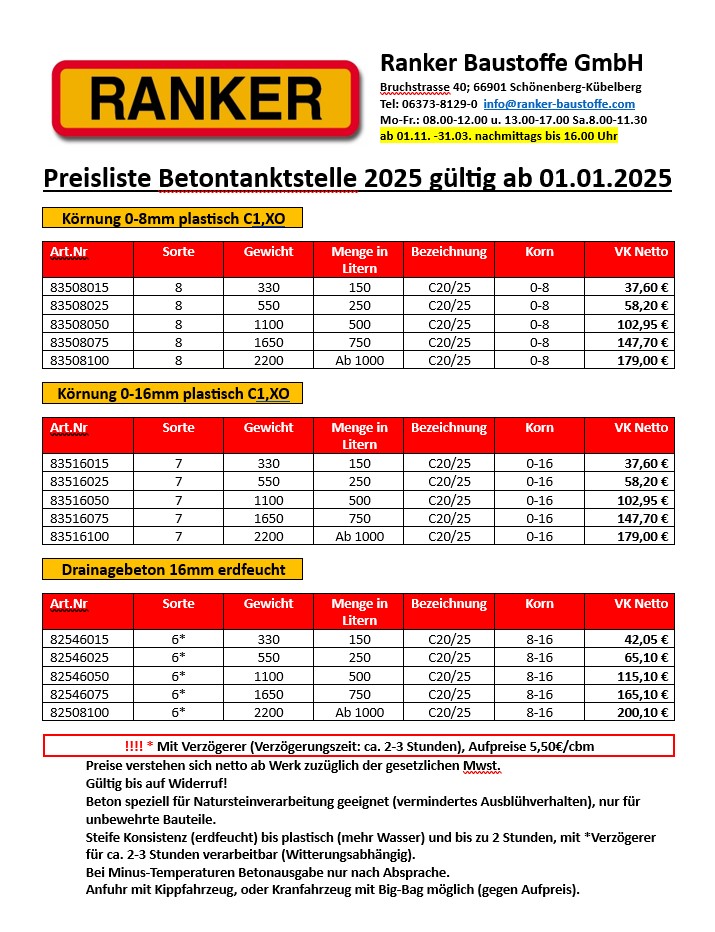 Preisliste Betontankstelle 2025 gültig ab 01.01.2025