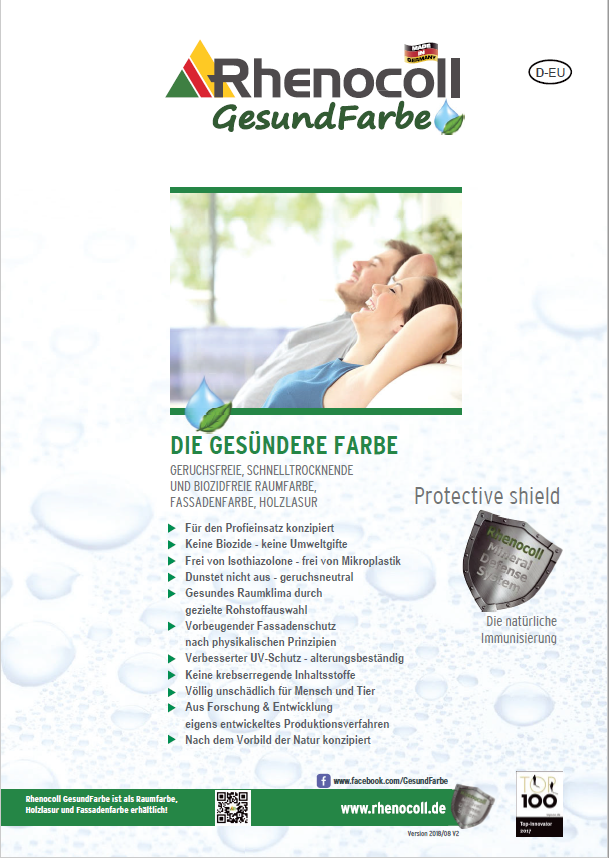 Die neue Gesundfarbe der Firma Rhenocoll jetzt bei uns an Lager! Geruchslos und frei von Bioziden und weiteren Zusatzmitteln. Nicht immer steht der "blaue Engel" auf herkömmlichen Farben für Hautverträglichkeit oder schadfreie Zusatzstoffe. Überzeugen Sie sich selbst und schauen Sie sich den Beitrag der ARD über die Wertlosigkeit der Gütesiegel an. Wir haben die Alternative! Für mehr Infos einfach auf die Broschüre klicken,